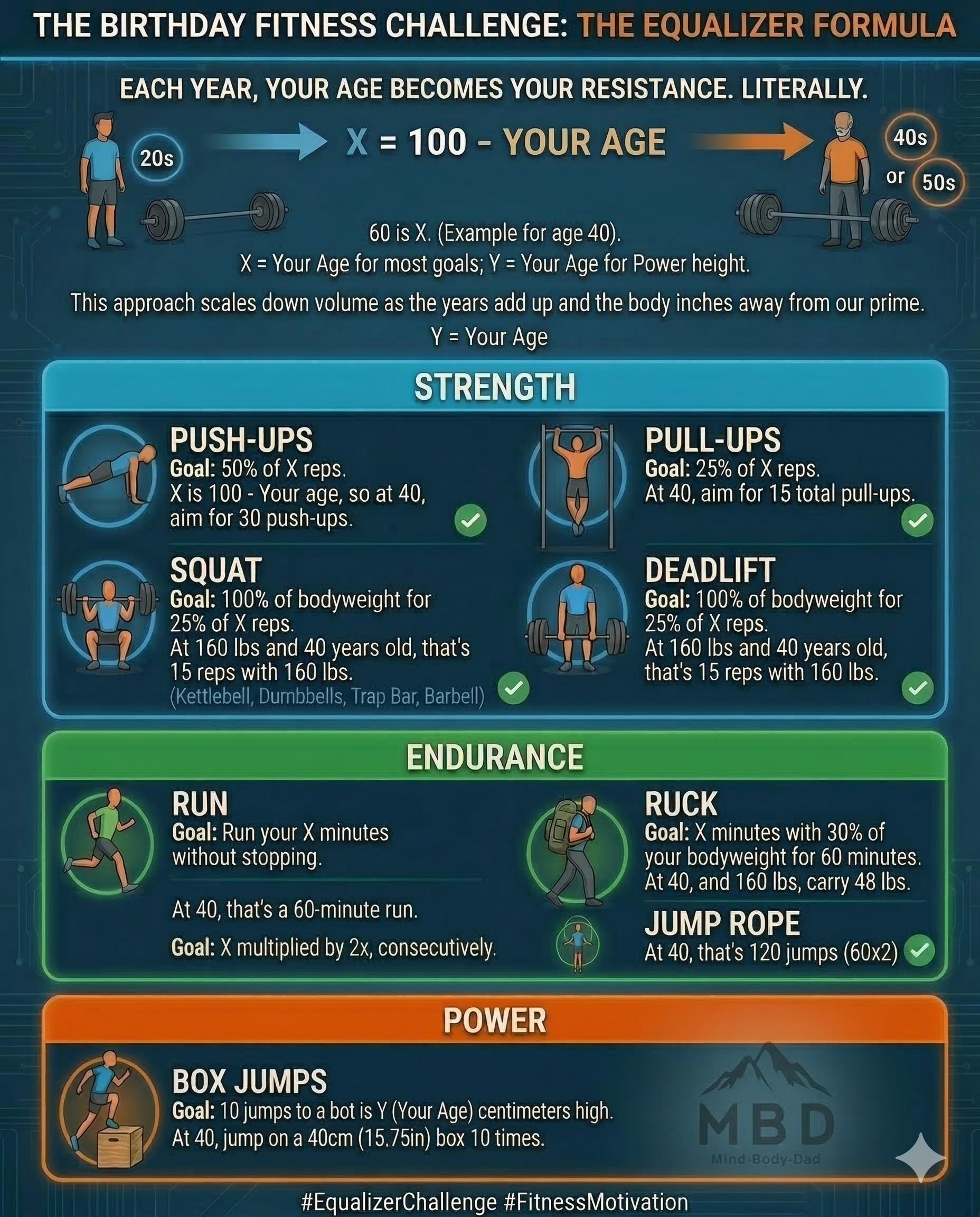 Example: X is 100 - Your age, so at 40, aim for 30 push-ups.