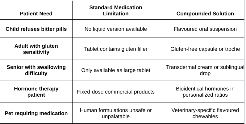 Individuals with allergies or sensitivities: Commercial medications often contain fillers, dyes, or preservatives that trigger reactions. Compounding allows for hypoallergenic formulations - free of lactose, gluten, soy, or artificial colours.