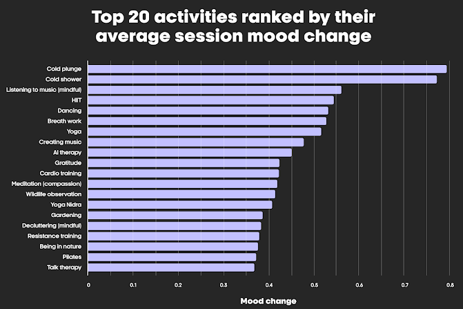 The app, Bearmore, reviewed 3,110 sessions and found that 38 of 39 activities were linked to short-term mood improvements. Cold exposure, breathwork, gratitude, and music topped the list, with 10-19 minutes emerging as the sweet spot. Focus and repetition mattered, and morning or early-evening sessions outperformed mid-afternoon sessions.