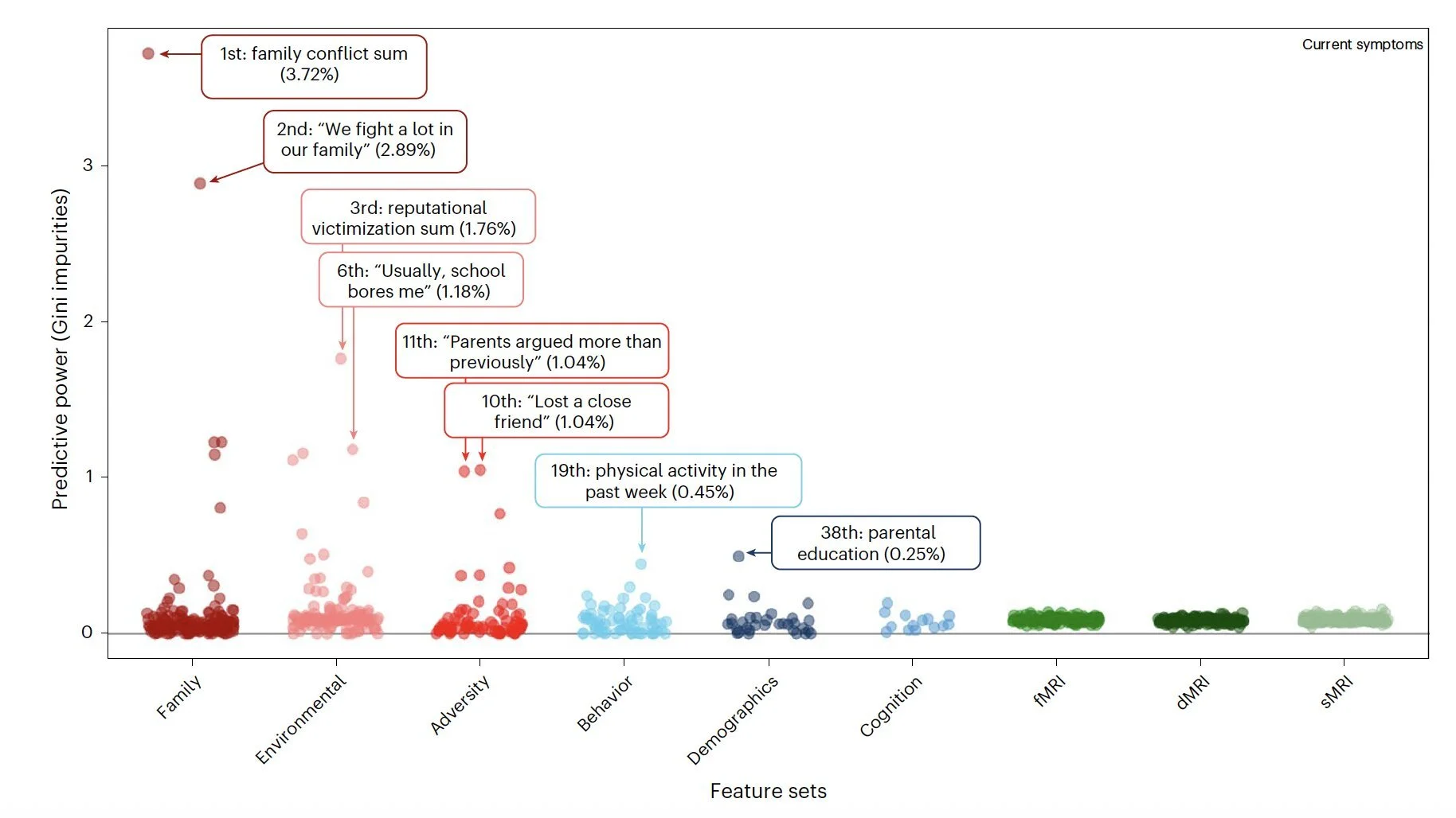 A large analysis of more than 11,000 teens from the ABCD study found that family conflict was the single strongest predictor of current mental health symptoms. Fighting, arguing, and verbal hostility inside the home predicted problems better than any brain scan or demographic factor. Peer issues like bullying and reputational loss ranked second. Neuroimaging was the weakest predictor, despite its popularity in research circles.