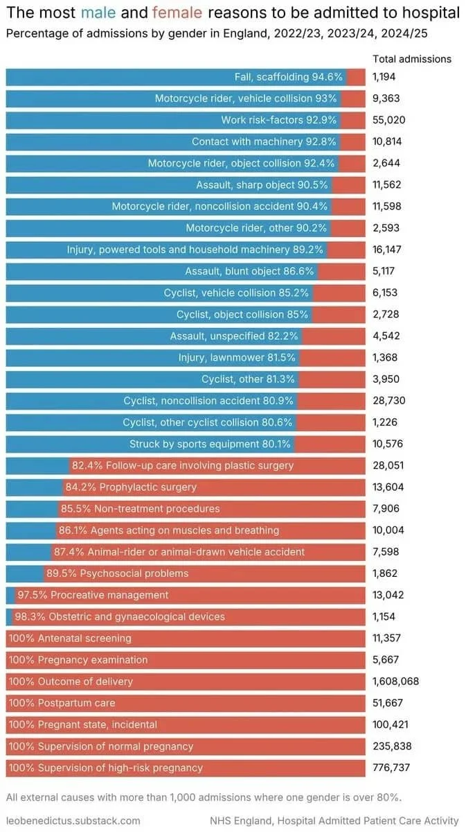 England’s hospital data shows a simple pattern. Men injure themselves doing questionable activities involving motorcycles, scaffolding, or lawn equipment. Women show up because they’re busy producing children. Delivery alone brought in more patients than some countries’ entire populations.